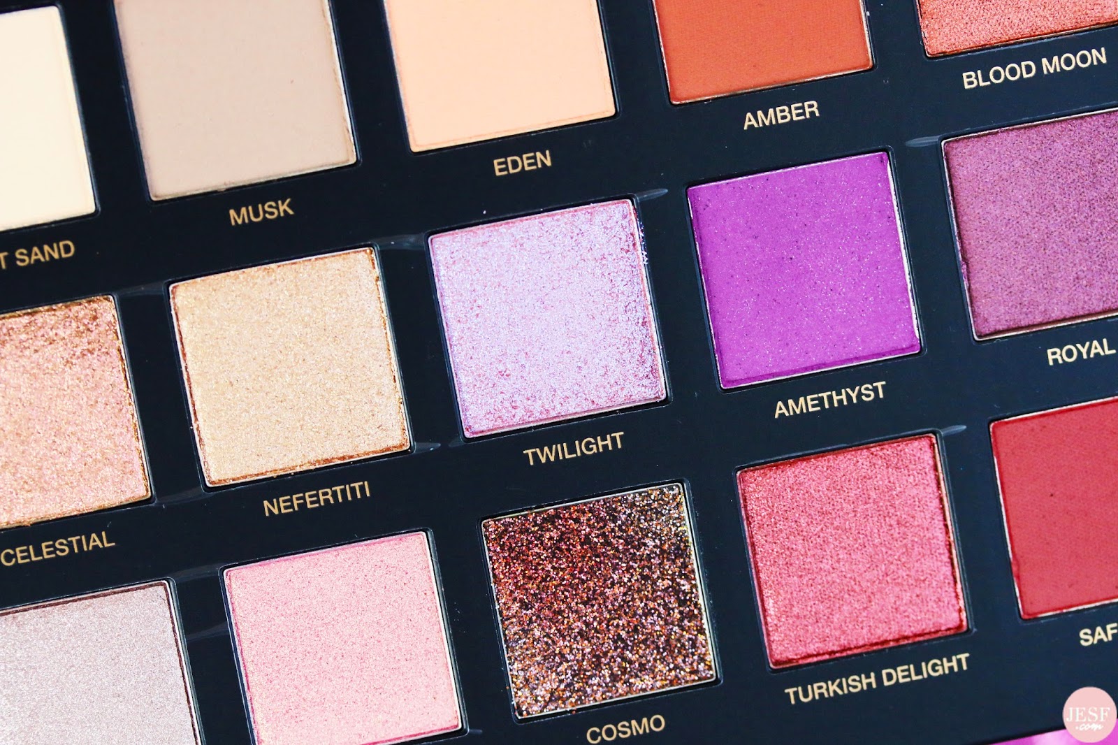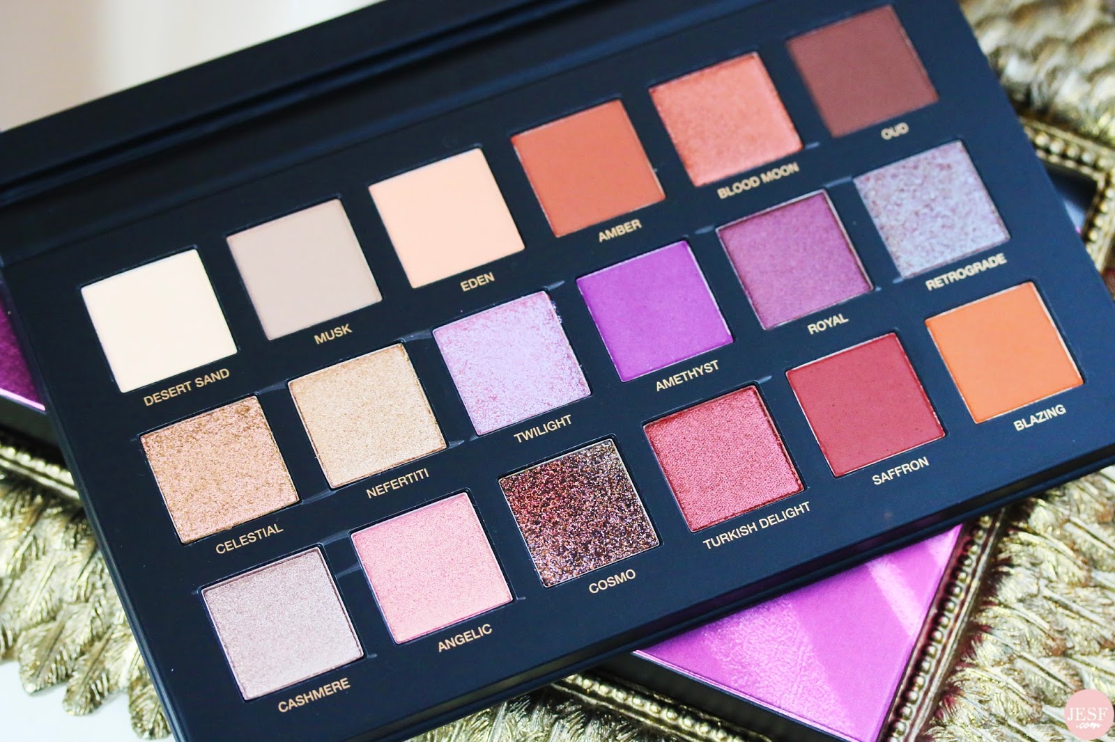 Abordons maintenant le nerf de la guerre, les fards. La palette Desert Dusk est composée de 18 fards: 8 fards mates (Desert Sand, Musk, Eden, Amber, Amethyst, Oud, Saffron et Blazing), 6 fards au fini hyper irisé (Blood Moon, Nefertiti, Royal, Cashmere, Angelic et Turkish Delight) et 4 fards duo chromes type « topper » (Twilight, Retrograde, Celestial et Cosmo). Et tous, sans exception, sont hyper pigmentés. Même les fards mates de couleur chair comme Desert Sand, Musk ou encore Eden sont concernés. Mais les fards les plus pigmentés sont les fards irisés. En y pensant, c’est la palette la plus pigmentée que je dois avoir.