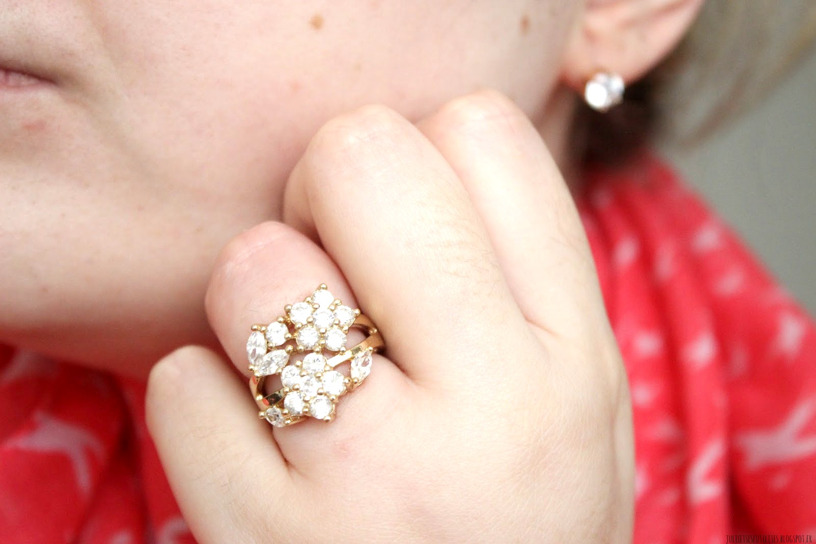 bague en plaqué or, sertie de petites pierres blanches montées en forme de fleurs (