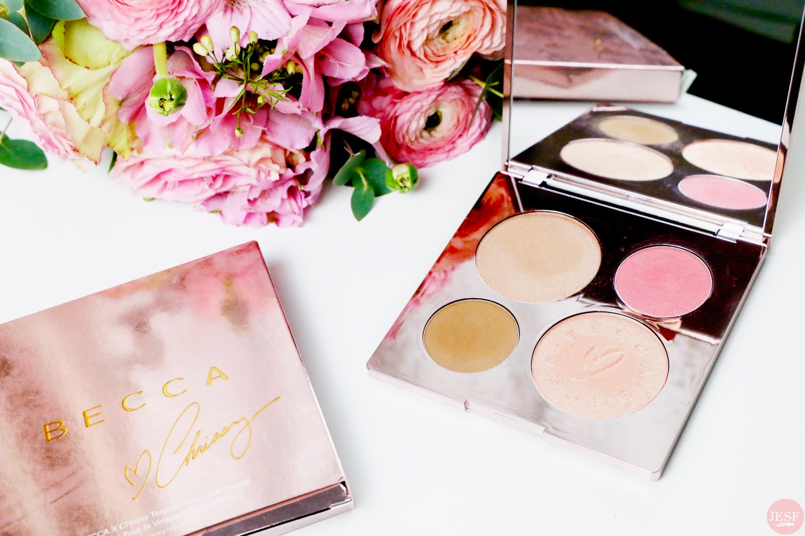 Disons le clairement, le packaging en jette ! Cet effet marbre dans les tons rose gold est juste sublime. Quand vous l’avez en main – oui, je sais, ça va être difficile à retranscrire par écrit ahah !, vous avez l’impression de tenir un écrin qui recèle un objet précieux. La palette est lourde, en plastique rigide. Une fois ouverte, vous découvrez, comme dans tous les produits Becca, un miroir où se trouve 4 fards et non 5 comme pour la précédente collaboration avec Jaclyn Hill.