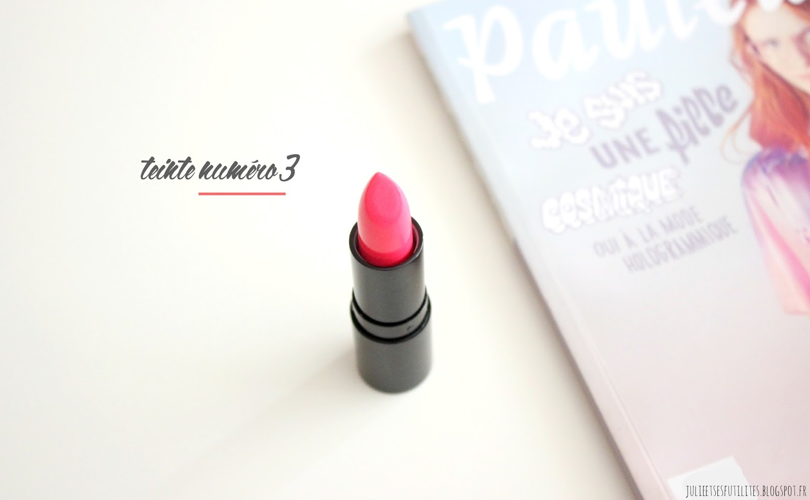 On commence avec ma teinte coup de cœur de cette gamme de rouge à lèvres bon marché: la teinte numéro 3. Ce rose tendre rehausse délicatement la couleur naturelle de mes lèvres. En un seul passage, comme pour les deux autres que je vais vous présenter d’ailleurs, j’obtiens un fini opaque et glossy. Tout ce que j’aime !